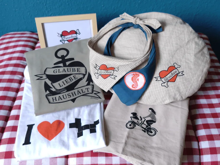 Einige der Produkte stelle ich selbst in Hamburg her: Ich nähe Halstücher, ebenso wie Schnüffelteppiche und Reisebetten für Hunde. Auf T-Shirts, Taschen und Halstücher drucke ich meine Motive per Siebdruck.