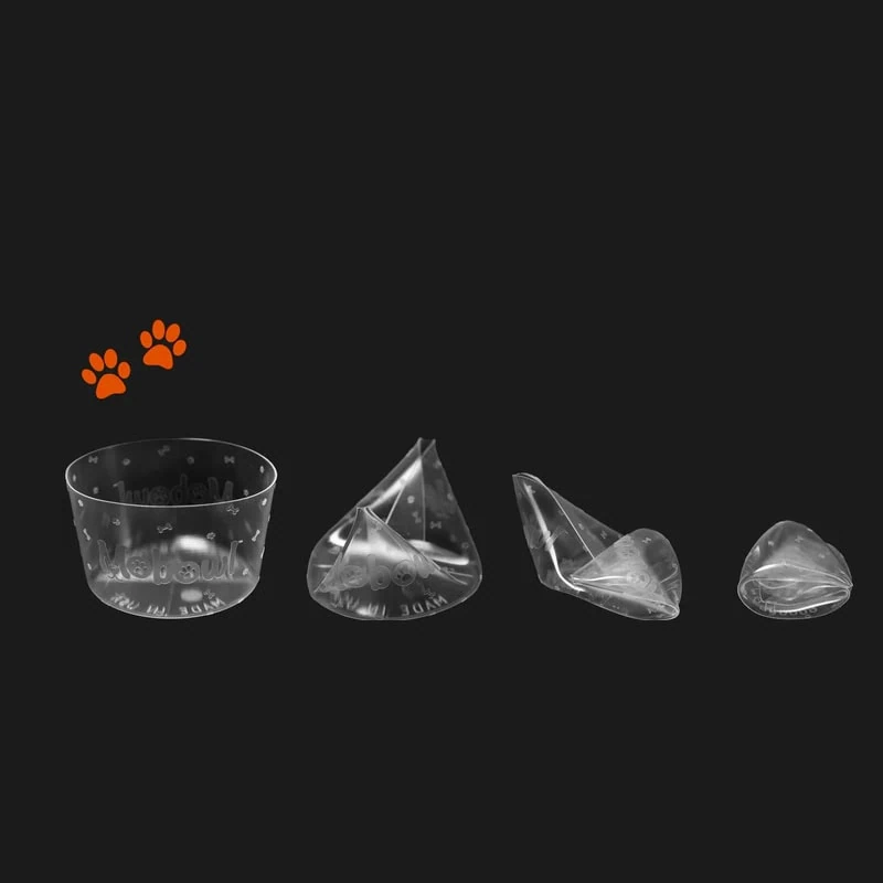 Der Napf passt in die Hosentasche. Da er nur innen nass wird, feuchtet auch nichts in der Tasche durch. Mit seinem praktischen Täschchen bleibt er schön kleingefaltet und kann an verschiedenen Orten mit dem Klettverschluss befestigt werden. Sobald man ihn aus dem Täschchen holt, springt er wieder in seine Form.
