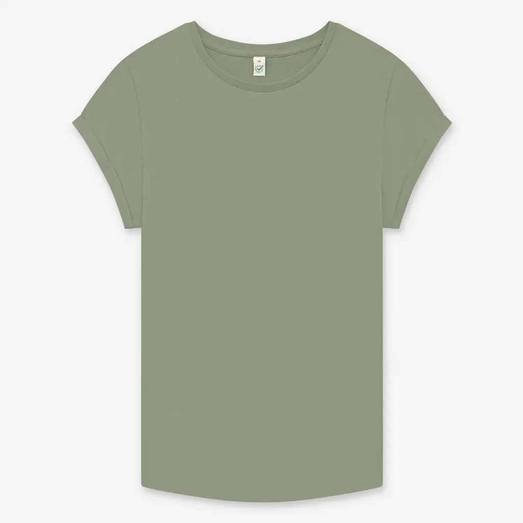 Der Farbton des Shirts ist helles Olive, quasi ein Nato-Pastell. Highlights sind die aufgerollten Ärmelchen und der abgerundete Saum.