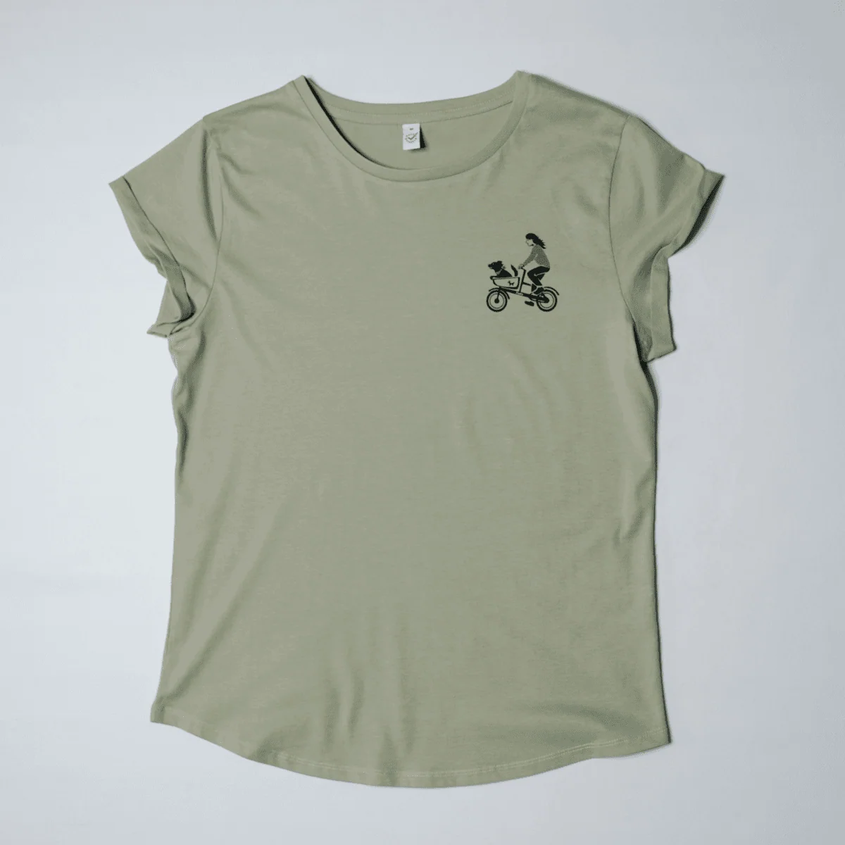 Der Farbton des Shirts ist helles Olive, quasi ein Nato-Pastell. Highlights sind die aufgerollten Ärmelchen und der abgerundete Saum.