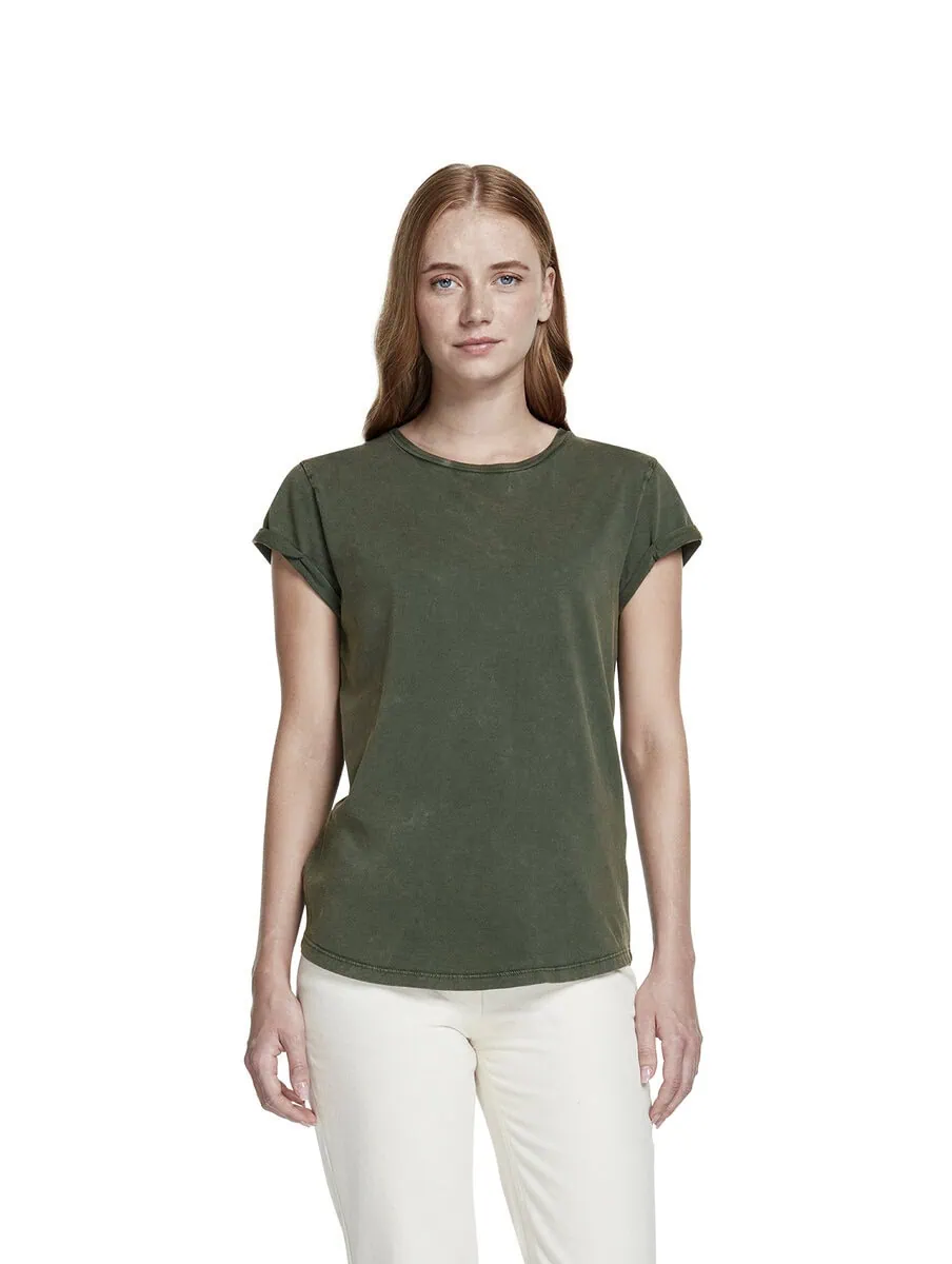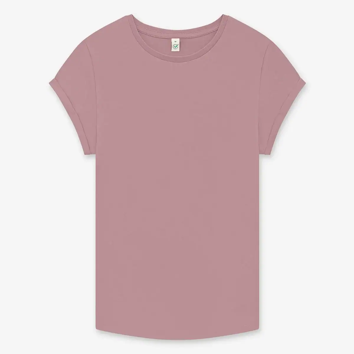 Der Farbton des Shirts mit aufgerollten Ärmelchen und abgerundetem Saum ist ein Rosé.