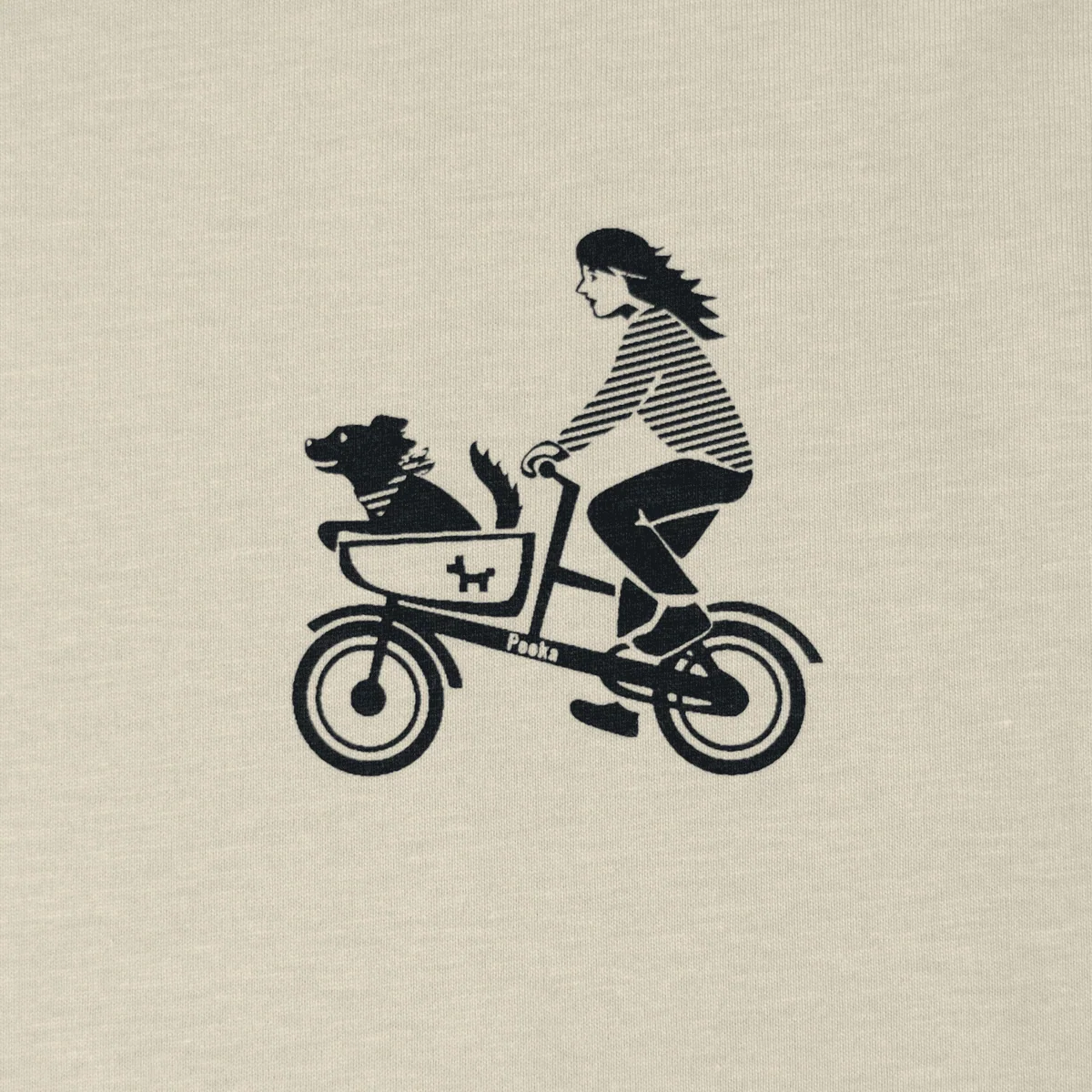 Ein Hundetaxi mit zwei Rädern: Der Hund sitzt im Cargobike und lässt sich den Wind um die Spürnase wehen. Frauchen trägt ein gestreiftes Shirt, natürlich passend zum Halstuch des Hundes.