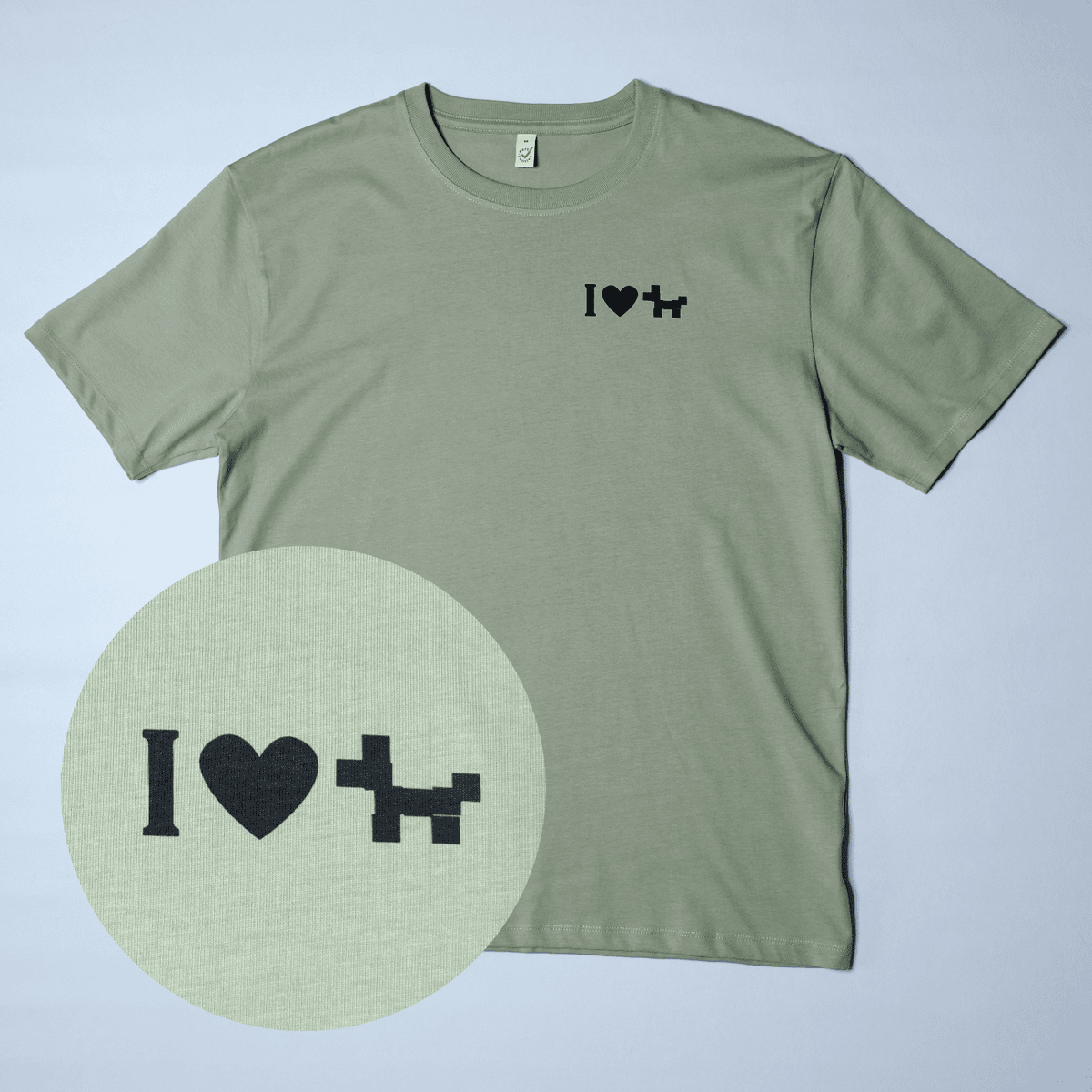 Auf die Brust habe ich mit Siebdruck das Hundeliebe-Motiv in Schwarz aufgedruckt. Das Shirt selbst ist in einem hellen Olive, wie Nato in Pastell.